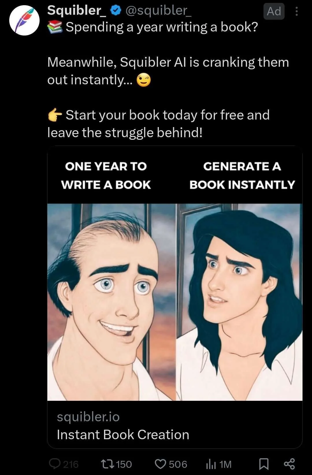 Though, could you imagine how awful it is for authors to see ads, such as Squibler’s, advertising an application that would allow authors to create their books within an hour as opposed to spending a year or more developing it naturally?